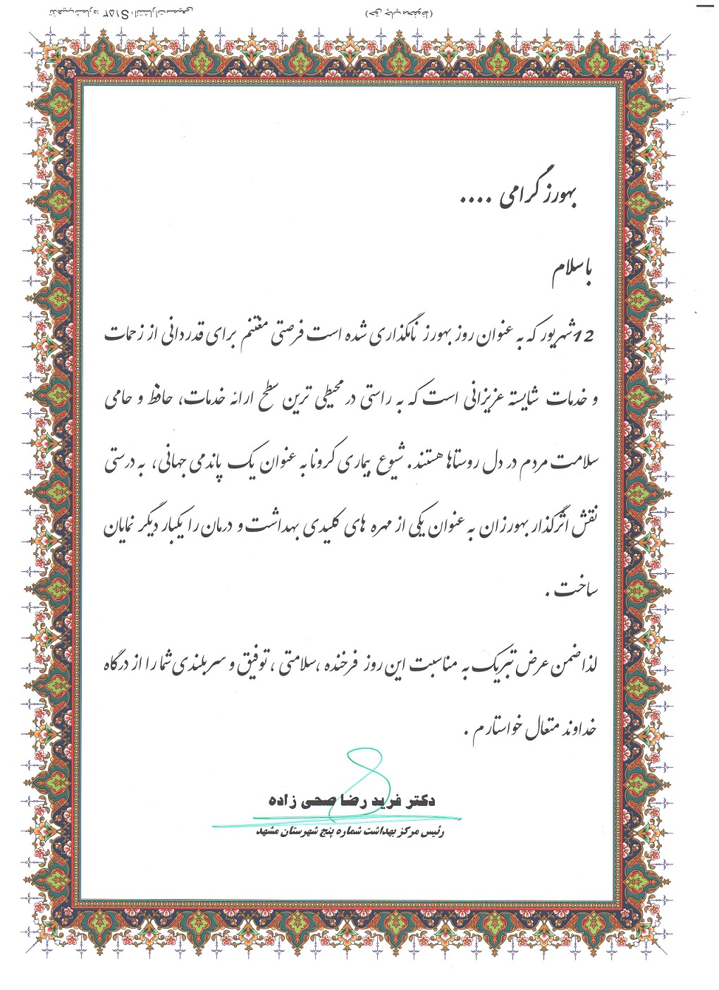 12 شهریور که به عنوان روز بهورز نامگذاری شده است فرصتی مغتنم برای قدردانی از زحمات و خدمات شایسته عزیزانی است که به راستی در محیطی ترین سطح ارائه خدمات، حافظ و حامی سلامت مردم در دل روستا ها هستند. شیوع بیماری کرونا به عنوان یک پاندمی جهانی، به درستی نقش اثرگذار بهورزان به عنوان یکی از مهره های کلیدی بهداشت و درمان را یکبار دیگر نمایان ساخت .