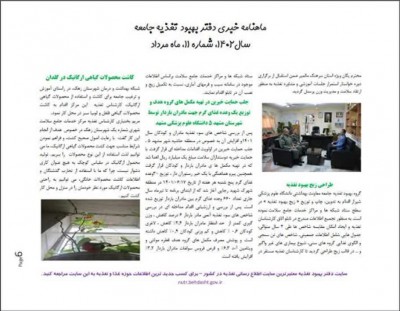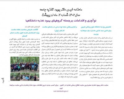 انتشار متن " جلب حمایت خیرین در تهیه مکملهای گروههای هدف و توزیع یک وعده غذای گرم جهت مادران باردار توسط شهرستان مشهد ۵ دانشگاه علوم پزشکی مشهد " در ماهنامه خبری دفتر بهبود تغذیه جامعه (معتبرترین سایت اطلاع رسانی تغذیه در کشور) / سال ۱۴۰۲ , شماره ۱۱, مرداد ماه/ تحت عنوان نوآوری و اقدامات برجسته گروههای بهبود تغذیه دانشگاهها