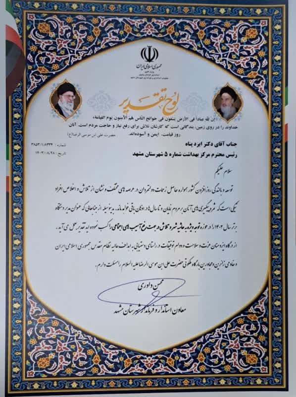 جناب آقای دکتر محمدمهدی ایزدپناه؛ ریاست محترم مرکز بهداشت شماره پنج مشهد مقدس انتخاب شایسته حضرتعالی به عنوان «مدیر برتر دستگاه سال ۱۴۰۲» که بیانگر حسن تدبیر، برنامه ریزی منسجم، سازماندهی موثر، کارآمدی و تلاشهای بی شائبه حضرتعالی می باشد مایه مباهات و افتخار است. این موفقیت ارزنده را به جنابعالی تبریک عرض نموده و از درگاه ایزد منان مزید توفیقات شما را برای خدمتی سرشار از شور و نشاط و مملو از توکل الهی در جهت رشد و شکوفایی ایران اسلامی مسالت داریم. کارکنان مرکز بهداشت شماره پنج مشهد مقدس |